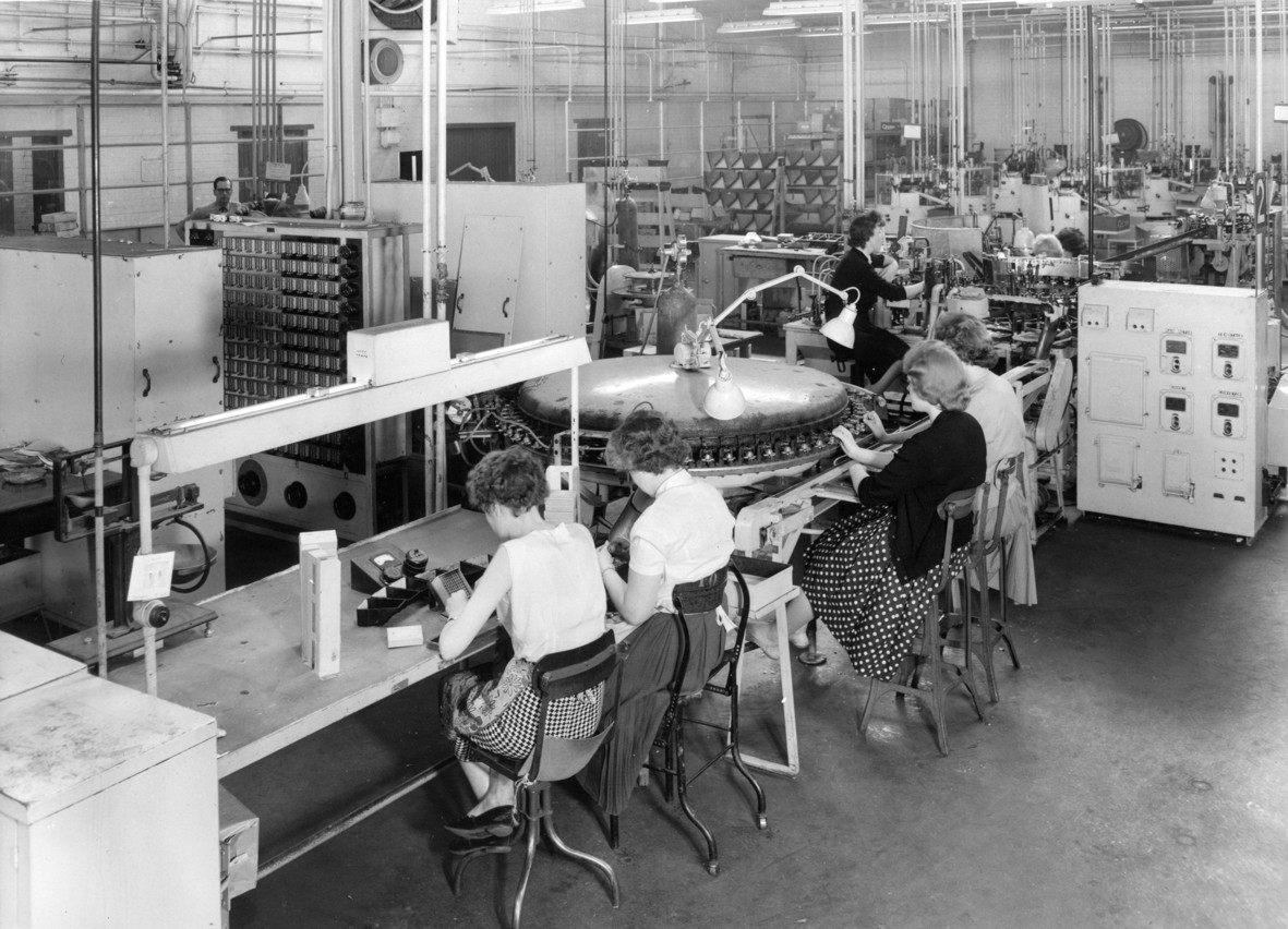By 1955 the first of the GLS High Wattage groups had arrived. One straight line production unit for the largest lamps of 300-1500W is visible, along with a second smaller line for 150-200W types. In a later photograph the 300-500W line is operating alongside four other groups for the 150-200W size lamps.