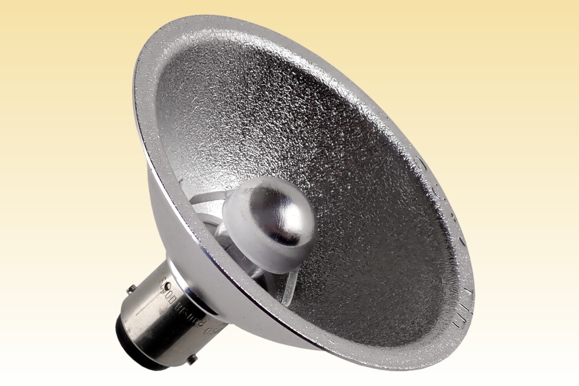 This particular lamp comprises a novel design feature which was first introduced by Osram, in the form of the anti-glare shield positioned directly above the halogen capsule. This is obviously based on the sealed beam PAR lamps such as the popular #4515 pinspot. It absorbs uncontrolled light rays which would normally exit the capsule without being controlled by the reflector, which can otherwise gives rise to acute glare. A drawback of this original shield design was that customers would often hold the lamp at this point, and distort its position during lamp installation.